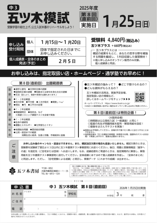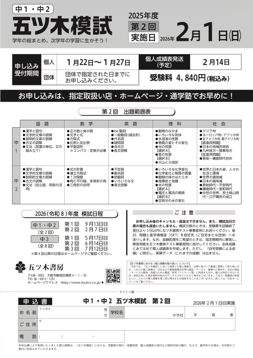 第2回 五ツ木の模擬テストのご案内 【中1・2年生】